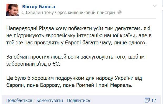 “Напередодні Різдва хочу побажати усім тим депутатам, які не підтримують європейську інтеграцію нашої країни, але в той же час проводять у Європі багато часу, лише одного. За обман простих людей вони заслуговують того, щоб їм заборонили в'їзд в ЄС”, - написав Балога на своїй сторінці у Facebook.
