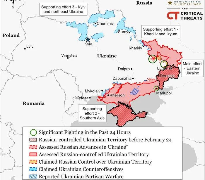 Усі бойові дії ведуться на кордоні з Росією та Білоруссю. Або на кордоні з територією, окупованою раніше Росією. Ні з ким іншим Україна не воює.