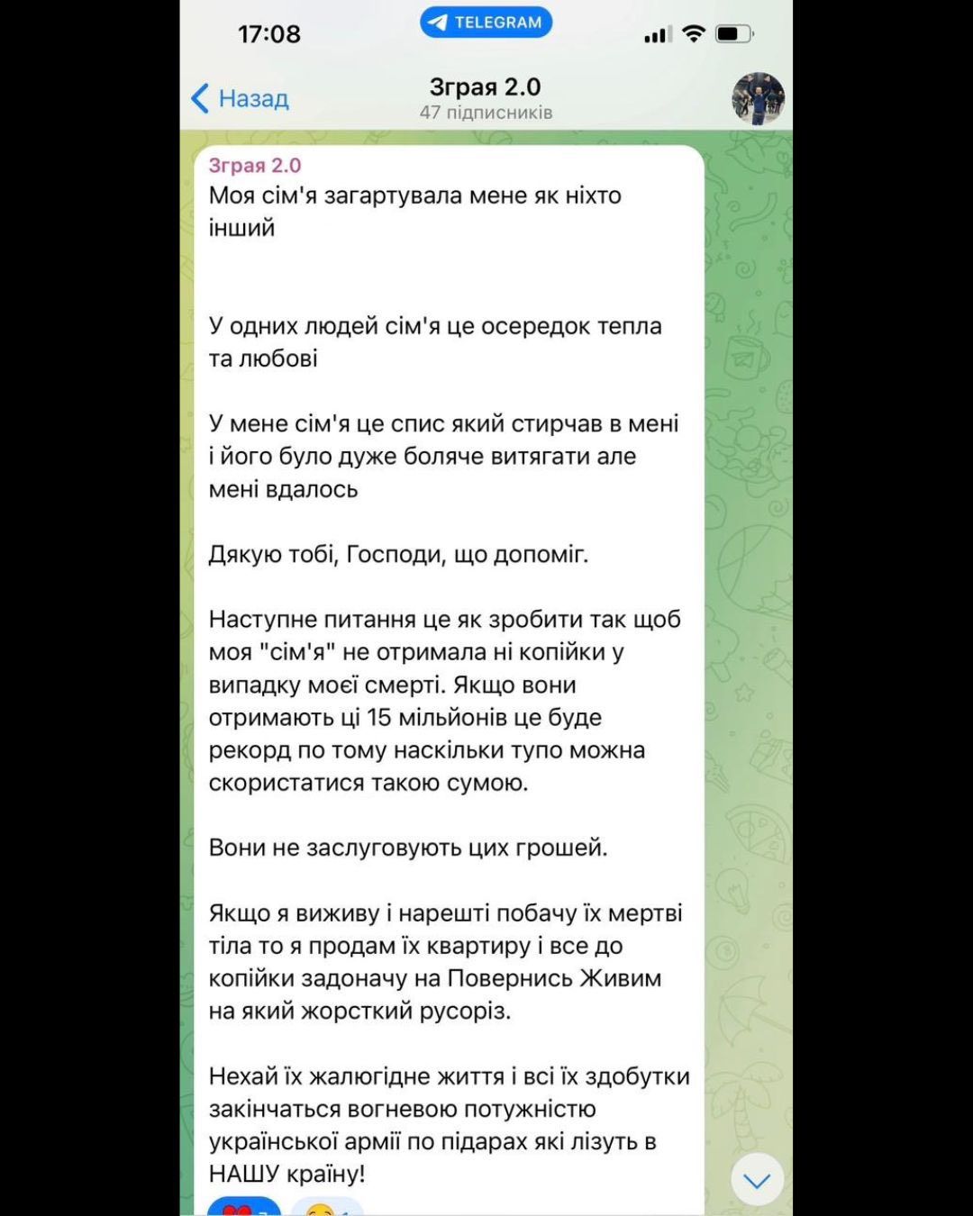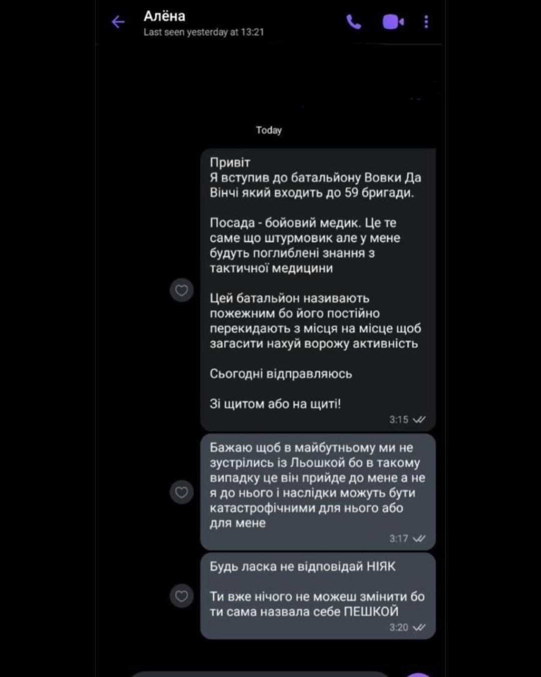 Вона розповіла, що батько припинив спілкування з сином після того, як той у 2024 пішов добровольцем до ЗСУ та почав служити в 108 окремому механізованому батальйоні "Вовки Да Вінчі".