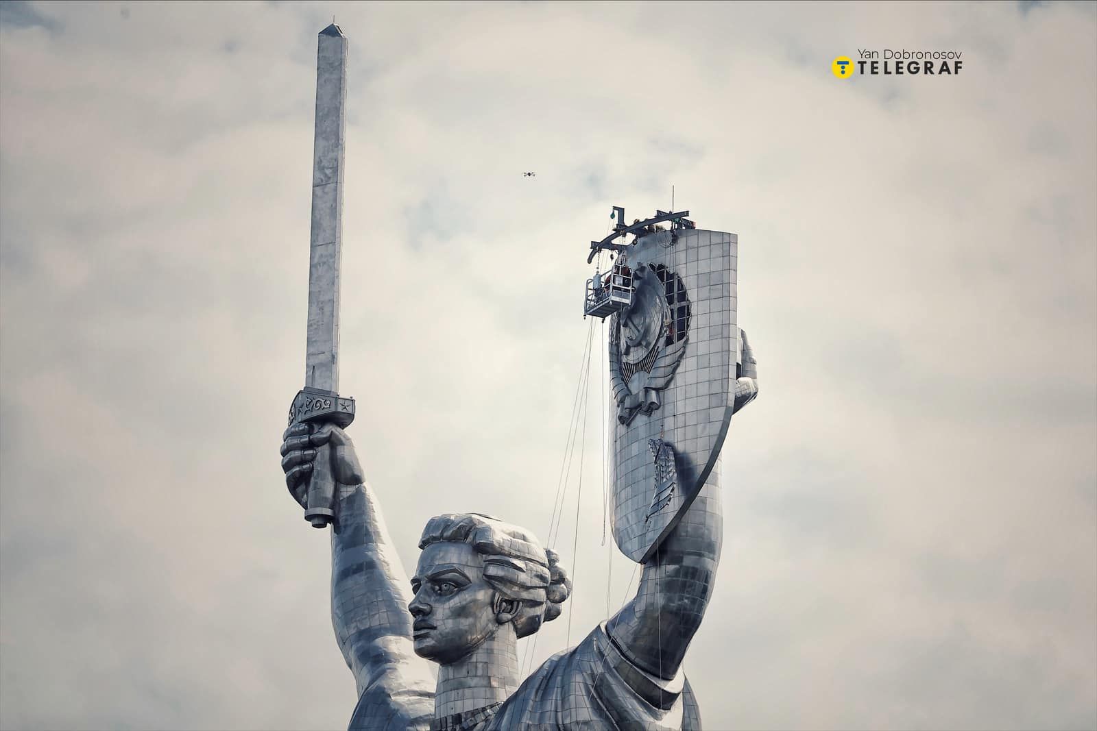 У Мінкульті повідомили, що 30 липня на монументі "Батьківщина-мати" розпочалися роботи з демонтажу радянського герба в межах проєкту "Тризуб Батьківщини". Завершити усі роботи планують до 24 серпня 2023 року.