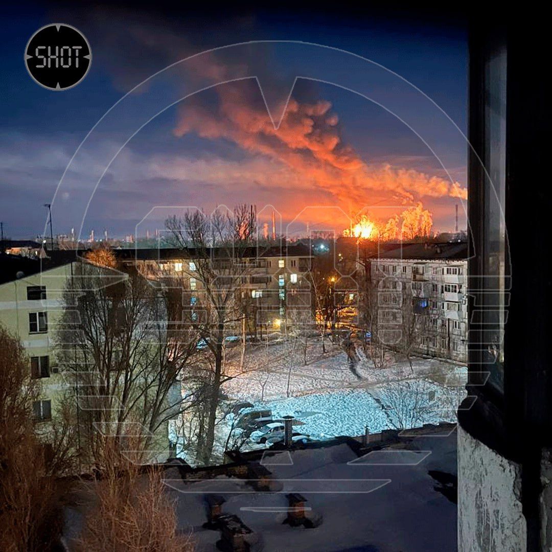 О пів на 4 ранку російські пропагандисти написали, що горить колона нафтопереробної установки. Також зазначили, що сталося це після "падіння" дрона. На місці працюють пожежники.
