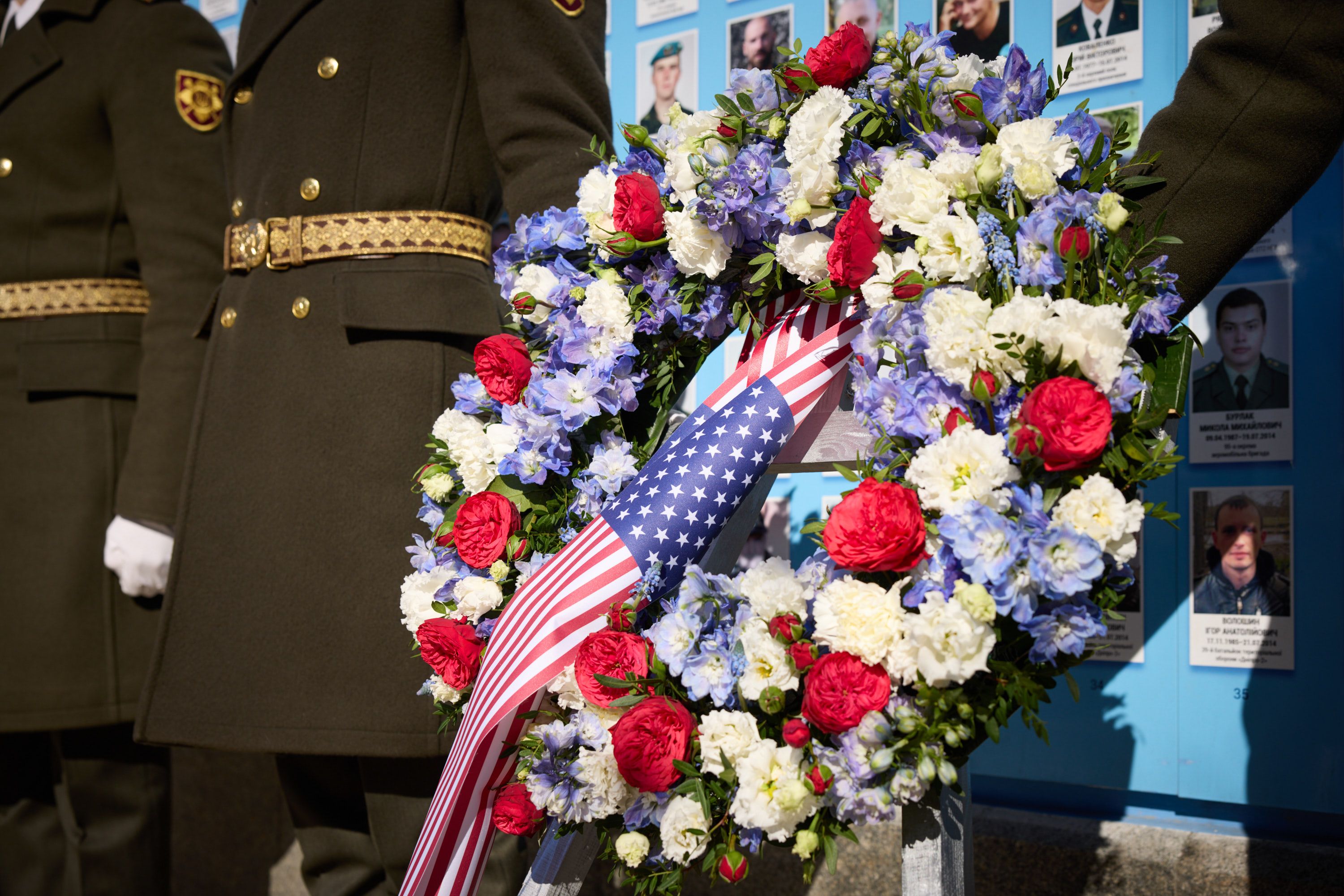 Американський лідер під звуки сирени разом з Зеленським поклав квіти до стіни пам'яті загиблим під час подій на Майдані. Як відомо, в Україні щороку 20 лютого вшановують пам'ять героїв Небесної Сотні.