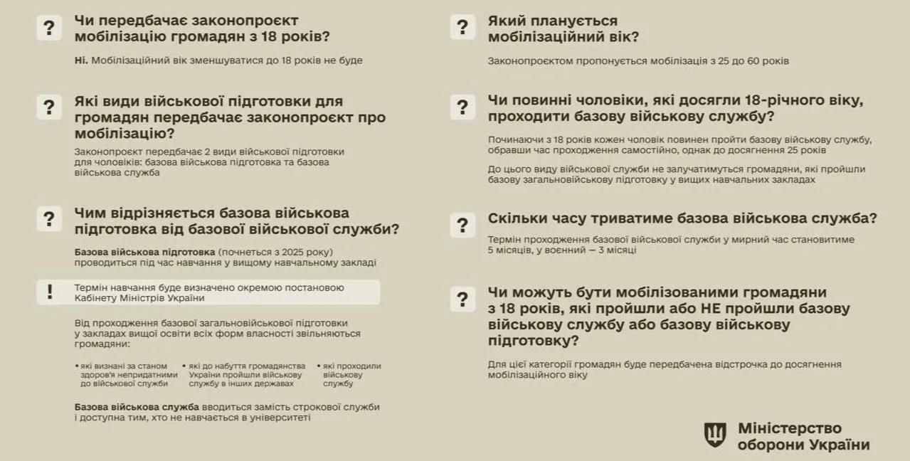 Водночас важливо, що законопроєкт №12076 не передбачає мобілізацію юнаків до 25 років. Призовний вік так і лишається на рівні 25 років. Для громадян з 18 років, які пройшли або не пройшли базову військову службу або базову військову підготовку передбачена відстрочка до досягнення мобілізаційного віку.