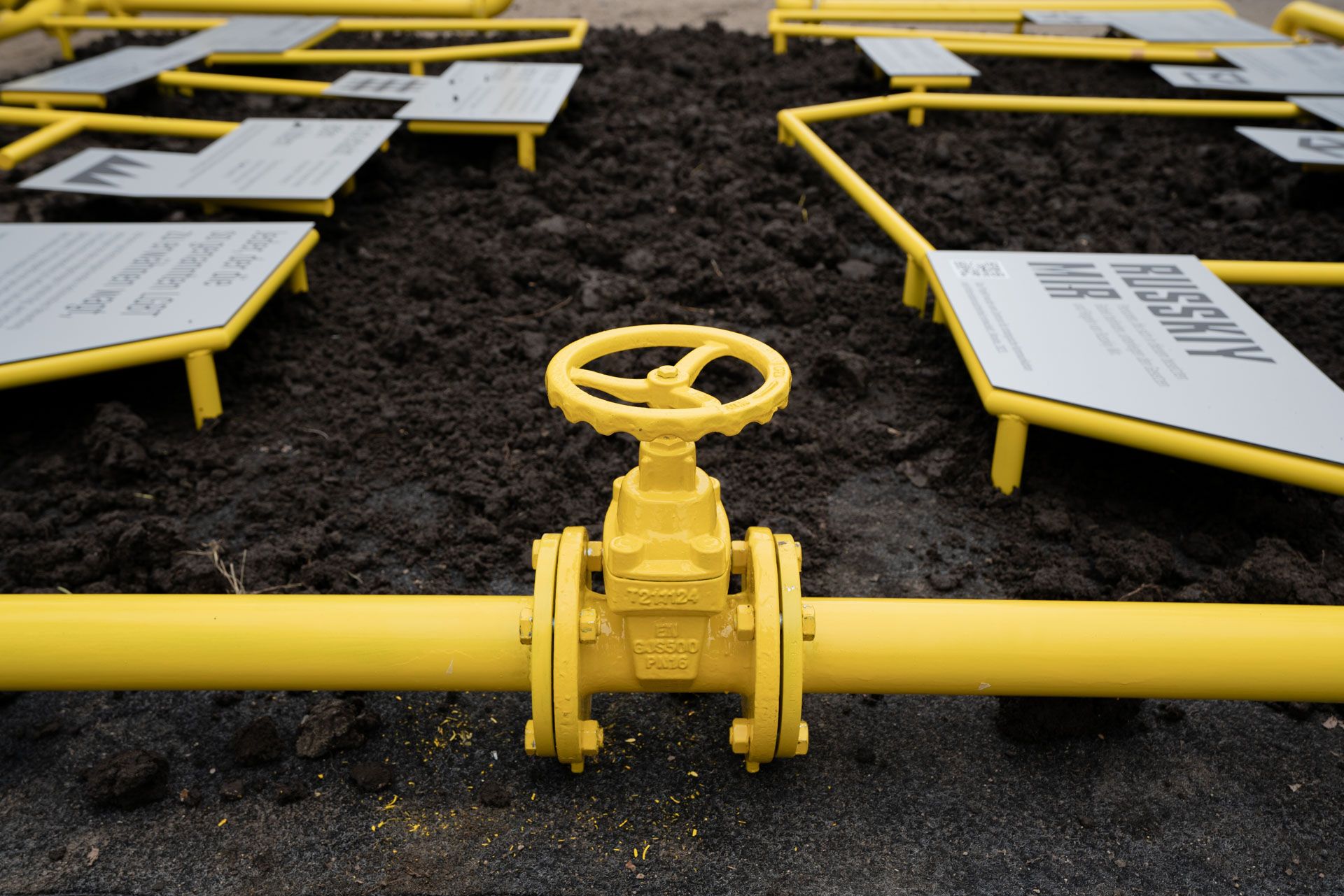 Інсталяція схожа на огорожу у формі газової труби жовтого кольору. На вході стоїть табличка з попередженням: усі, хто перебуває на цій окупованій території, повинні підкорятися правилам і законам "русского міра".