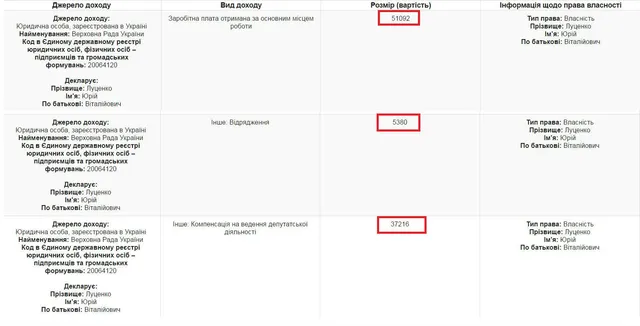 Зокрема, Луценко отримав 51 тисячу гривень доходу як депутат Верховної Ради. Ще він отримав від парламенту 5 тисяч гривень на відрядження і 37 тисяч гривень як компенсацію за ведення депутатської діяльності.