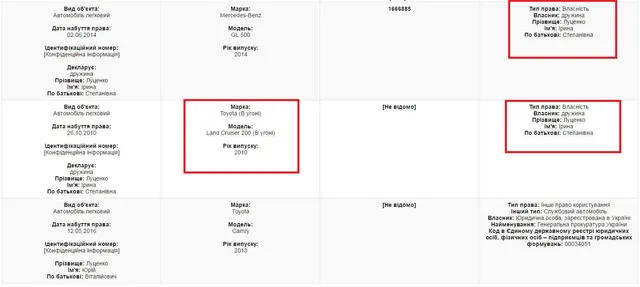 У Луценка також немає власного автомобіля – в його користуванні тільки службова Toyota Camry. При цьому у його дружини є два автомобілі – Mercedes-Benz GL 500 2014 року випуску, а також Toyota Land Cruiser 2010 року випуску (в угоні).