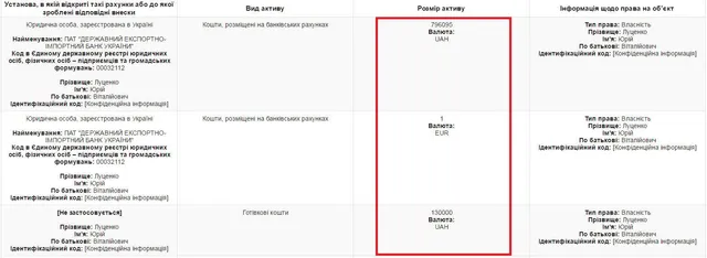 У його дружини готівкою є 195 тисяч гривень, 60 тисяч євро, 300 тисяч доларів. На банківських рахунках у неї 842 тисячі гривень, 2 тисячі доларів і 1,2 тисячі євро в "Укрексімбанку". 1,6 мільйонів гривень вона зберігає у банку "Столичний".