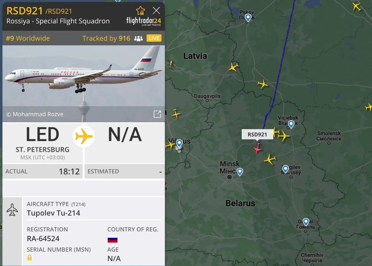 У мережі з'явилась інформація, що після 18:00 до Національного аеропорту "Мінськ" зайшов Ту-214СУС СЛО "Росія" з реєстраційним номером RA-64524, передає 24 канал.
