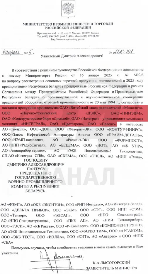 Згідно з листом заступника міністра промисловості та торгівлі Росії Кирила Лисогорського, відправленого очільнику державного військово-промислового комітету Білорусі Дмитру Пантусу, у 2025 році кабміни країн узгодили відправку до Росії продукції ВАТ "Витебский завод радиодеталей "Монолит", ВАТ "Научно-технический центр "ДЭЛС", ВАТ "НИИЭВМ", ВАТ "Конструкторське бюро "Дисплей", ВАТ "Інтеграл" – управляющая компания холдинга "Интеграл", ВАТ "Цветотрон" та ВАТ "Пеленг".