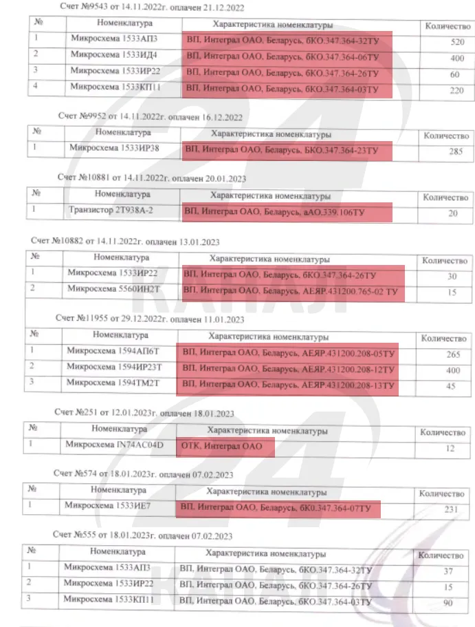 Дивіться документ із переліком частини мікросхем, які білоруський "Інтеграл" виготовляє для підприємств російської оборонки: