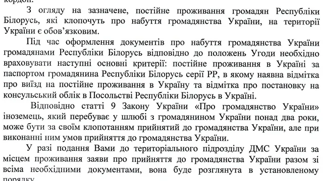 Потім Міграційна служба прислала мені ще один лист — відповідь на звернення з АП. Мені повідомили, що відповідно до якихось угод я повинен бути документований паспортом серії РР. У мене такого немає. Це спеціальний паспорт, отримати який навіть на території посольства не можна. Я повинен поїхати до Білорусі за місцем своєї тамтешньої прописки, здати свій абсолютно нормальний, дійсний білоруський паспорт і отримати паспорт серії РР. Це така спеціальна серія, яку придумали спеціально для громадян, які виїжджають на ПМЖ до іншої країни. При цьому у листі Міграційної служби нічого не написано про якісь особливі порядки, заслуги та інше. Просто перераховано, що повинен зробити будь-який звичайний громадянин Білорусі. Це не відповідь, а юридична консультація. Яка мені не потрібна.