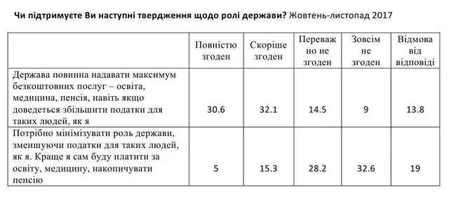 У той же час лише 20% опитаних підтримують протилежну позицію. На їхню думку, потрібно мінімізувати роль держави, зменшуючи податки для людей, які здатні самі платити за освіту, медицину і накопичувати власну пенсію.