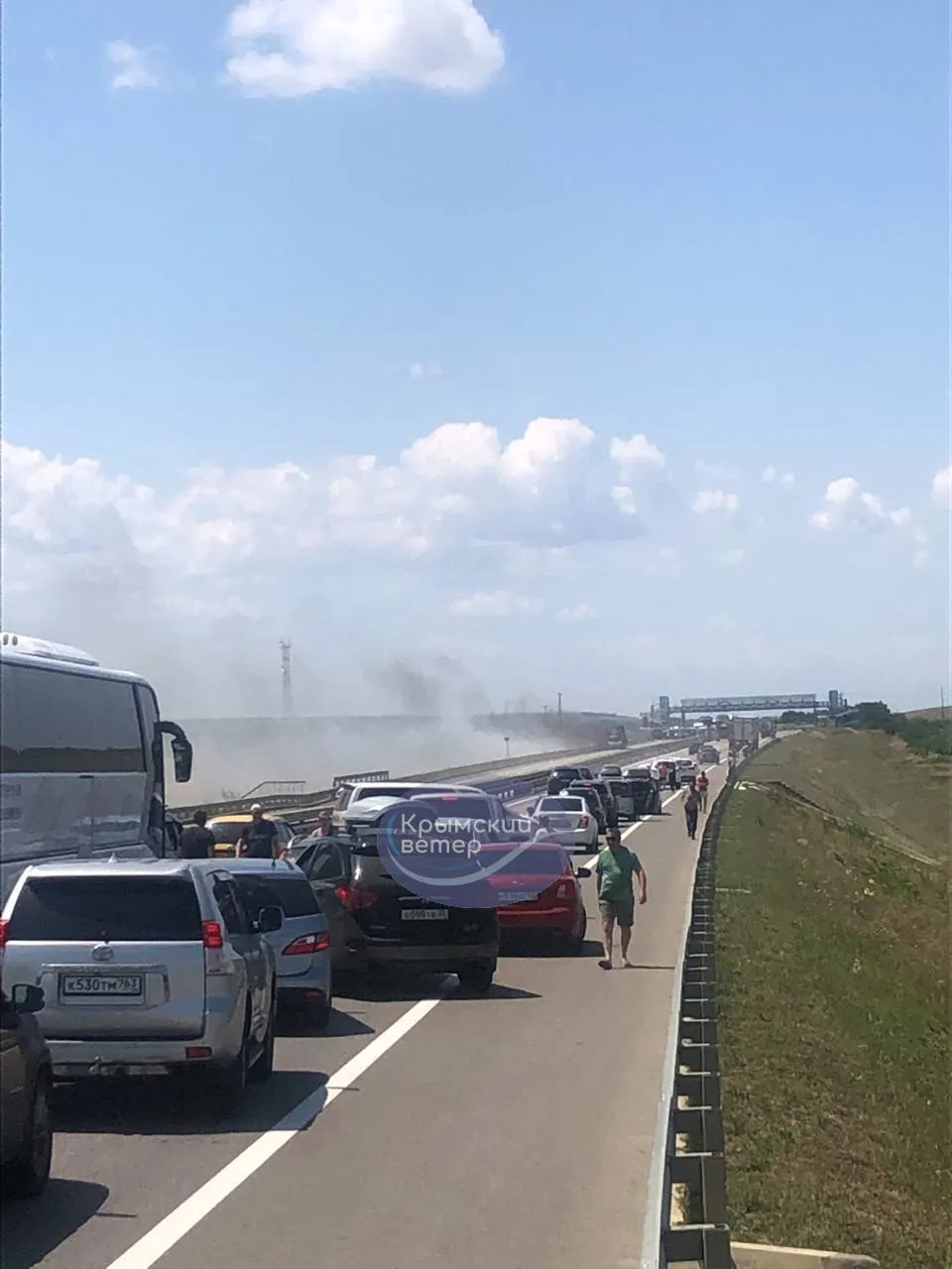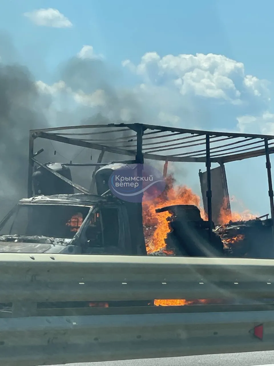Очевидці повідомляють, що ця вантажівка рухалася з напрямку Криму до російського Таманського півострова. Згодом у мережі опублікували кадри транспортного засобу у вогні.