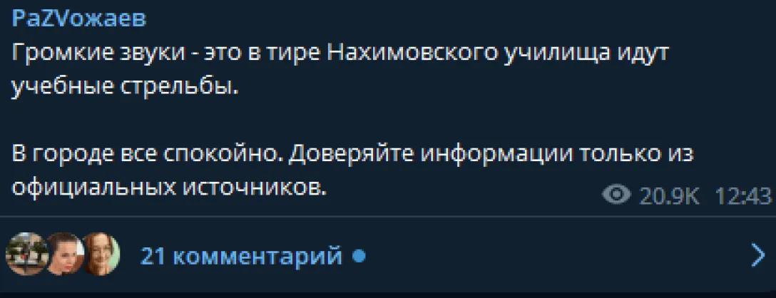 "Гучні звуки – це у тирі Нахімовського училища йдуть навчальні стрільби. У місті все спокійно", – намагався заспокоїти Развожаєв.