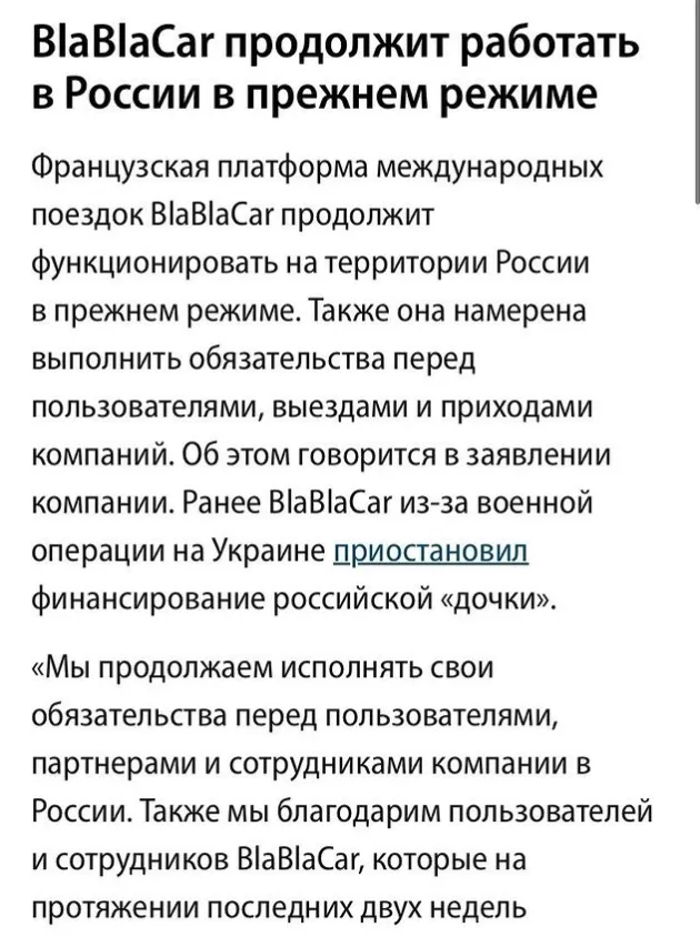 Російське видання "Коммерсантъ" поспішило заспокоїти своїх читачів: мовляв, BlaBlaCar продовжує працювати у них, як і раніше. "Там мають намір виконати зобов'язання перед користувачами, виїздами та доходами компаній", – підкреслили у ЗМІ. Й зазначили, що раніше BlaBlaCar зупинив фінансування своєї російської дочірної компанії.