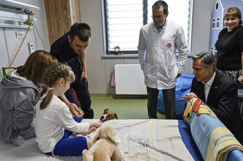 Під час неанонсованого візиту до столиці України Блінкен приїхав у лікарню "Охматдит", де навідав дітей, які одужують внаслідок російської агресії.