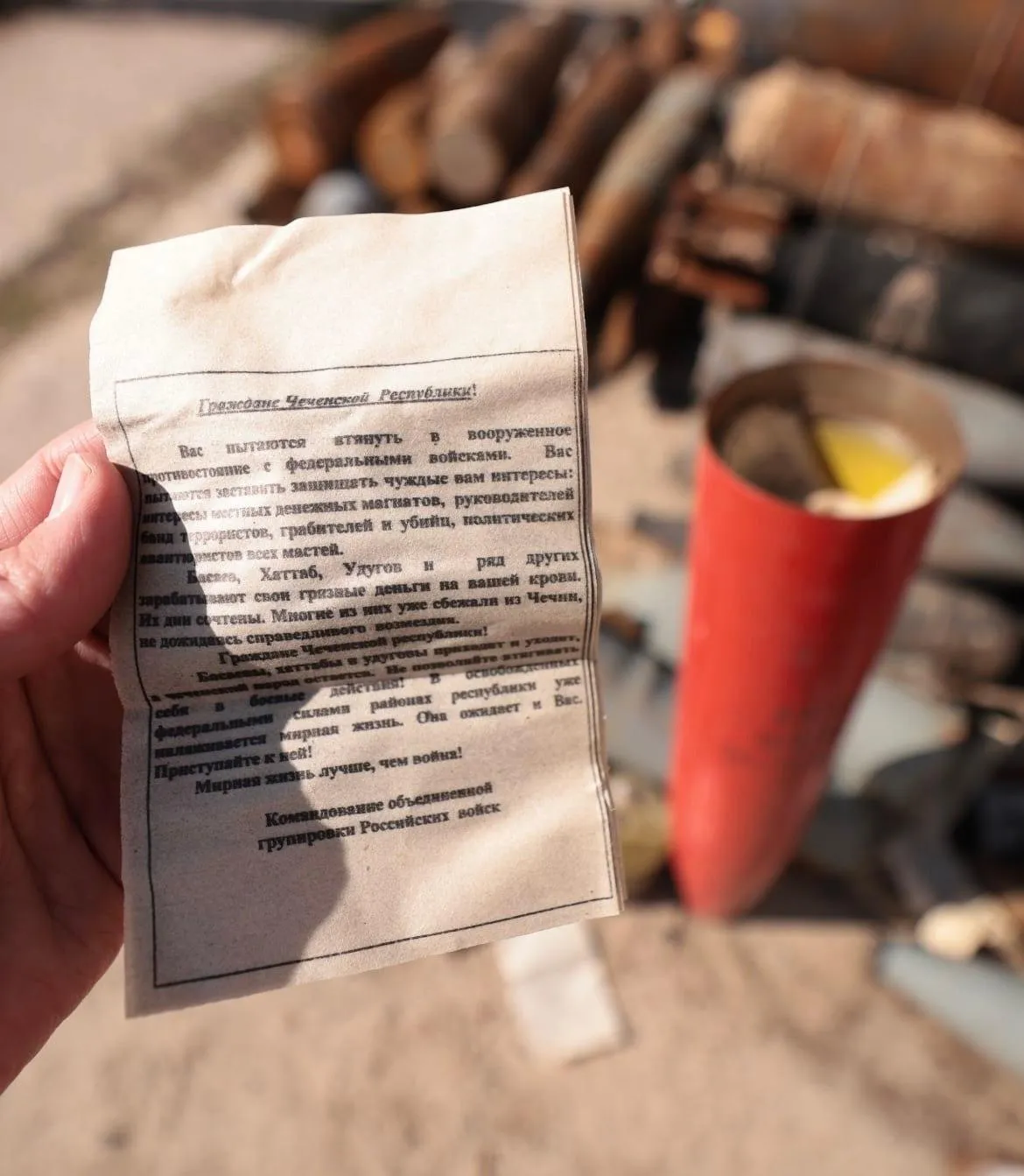 У цій листівці росіяни пояснювали жителям Чечні, що їх намагаються втягнути у збройне протистояння з федеральними військами та намагаються змусити їх захищати чужі для них цінності.