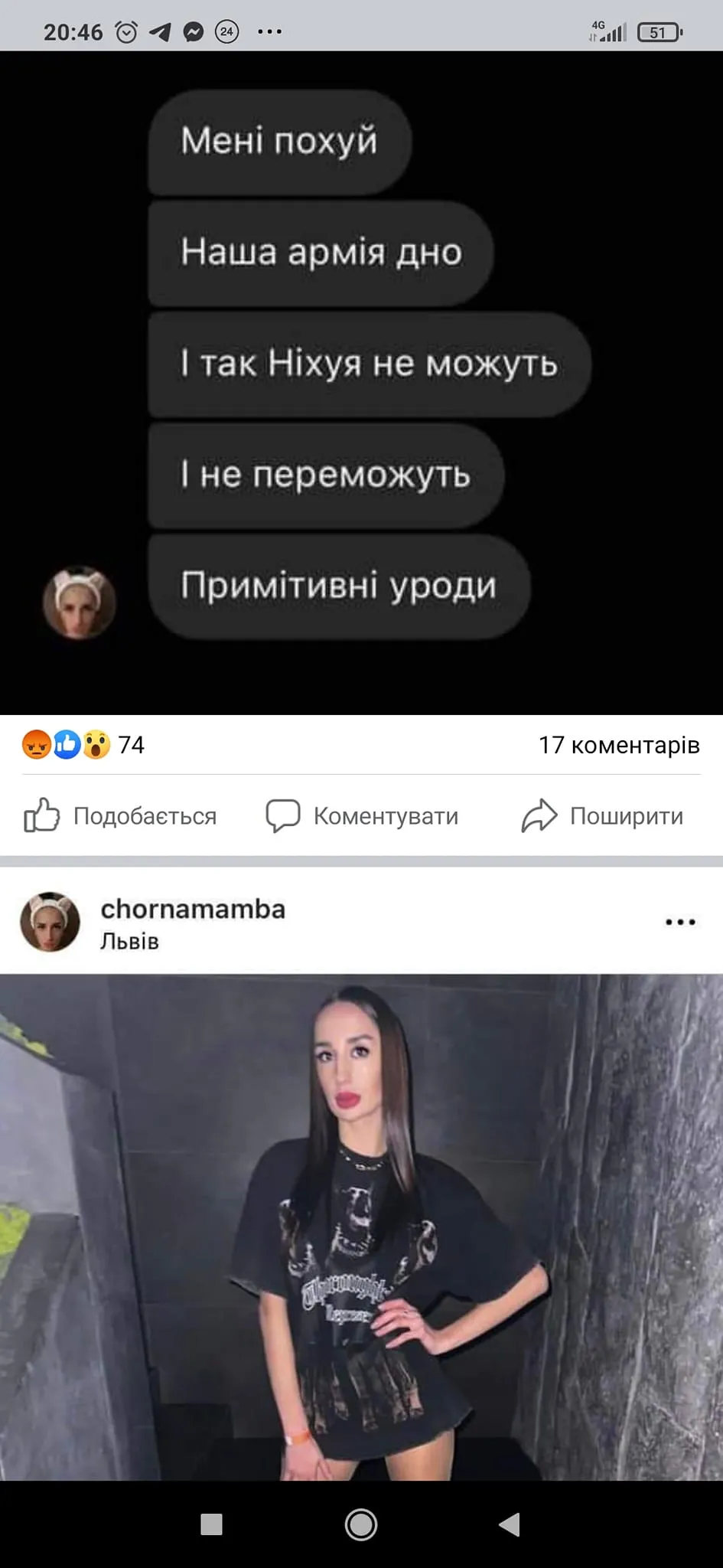 Дівчина закрила свій профіль, але на цьому скандал не закінчився. Її аудиторія почала писати їй гнівні коментарі, тож далі її ще більше "понесло". Вона цинічно назвала наших захисників "дном" та "примітивними виродками". На її думку, "вони нічого не можуть і не переможуть".