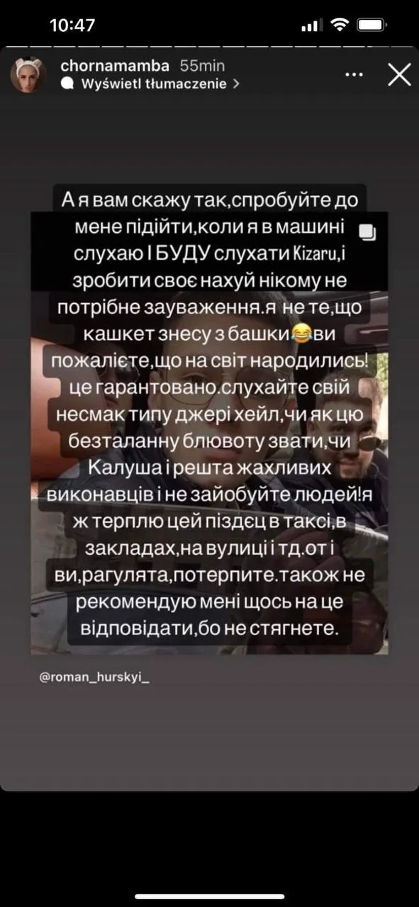 "Чорна Мамба", тобто львів'янка Христина Горун, відреагувала на скандал зі слухачами Лєпса в центрі Львова. Вона назвала українську музику "жахливим несмаком", а слухачів української музики – "рагулятами". Блогерка заявила, що їй "доводиться терпіти" українську музику скрізь, тож вона "знесе кашкет" тому, хто зробить їй зауваження за прослуховування російської музики.
