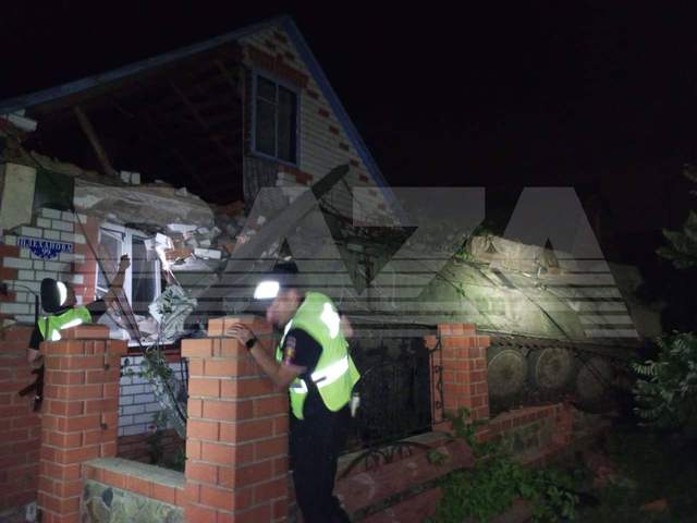 Згодом до розтрощеної домівки на вулиці Плеханова прибули російські поліцейські. Вони почали фіксувати факт ДТП з воєнним транспортом.