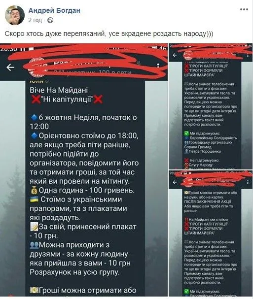Повідомлення нібито демонструють, що за участь в акції "Ні капітуляції" пропонують гроші. На скріншотах неперевіреної переписки, яка виглядає, як електронна, вказуються "суми" у 10 і 100 гривень.