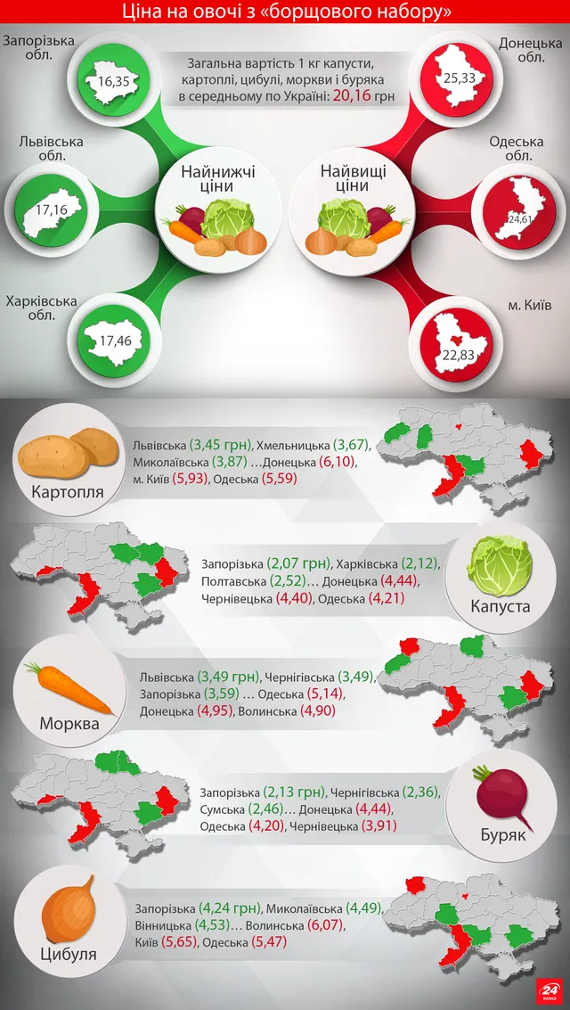 Щоправда, є низка регіонів, де такий набір коштуватиме на 10-15% менше, зокрема. у Запорізькій, Львівській та Харківській областях. А от найдорожчий "борщовий набір" – на Донеччині, Одещині та у Києві.
