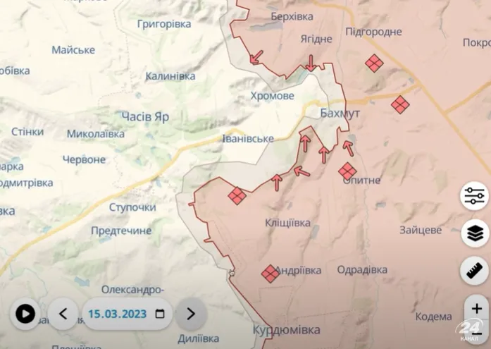 Карта бойових дій у районі Бахмута / Скриншот з відео