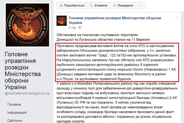 Окрім того, в розвідці зазначили, що бойовики вели вогонь по позиціям українських військових з важкого озброєння – ракетних систем залпового вогню "Град", 122- та 152-міліметрових артилерійських установок.