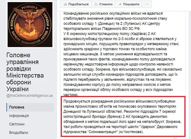 Зокрема, окупанти демонтують обладнання, а потім здають його на металобрух. Наразі демонтажні роботи російсько-окупаційні війська проводять на території шахти "Ударник" Державного підприємства "Сніжнеантрацит" (Донецька область).