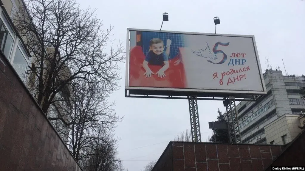 Реклама окупантів присвячена 5-річчю існування так званої республіки "ДНР". На білборді зображений хлопчик, який радісно з’їжджає з гірки. Біля його світлини розміщений великий напис "5 лет ДНР. Я родился в ДНР!".