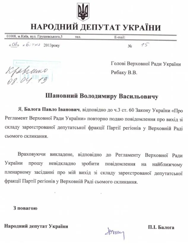 Нагадаємо, ще 13 грудня Павло Балога вийшов з фракції Партії регіонів. Він написав відповідну заяву, яку передав голові Верходної Ради України Володимиру Рибаку.