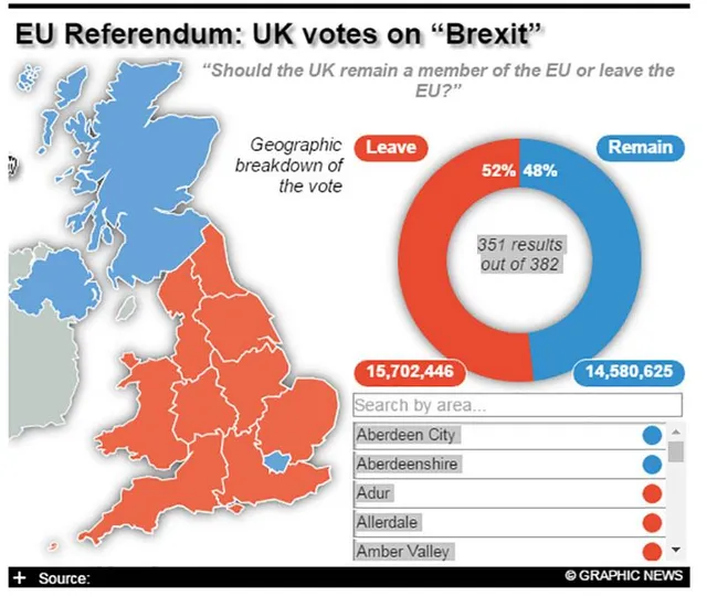 52% проголосували за Brexit (BRitish EXIT – вихід Британії), 48% – проти цього. Наразі підраховано голоси на 351 з 382 виборчих округів, передає Independent.