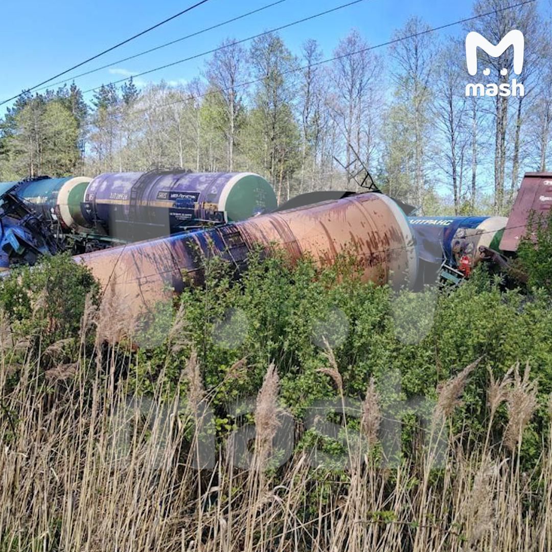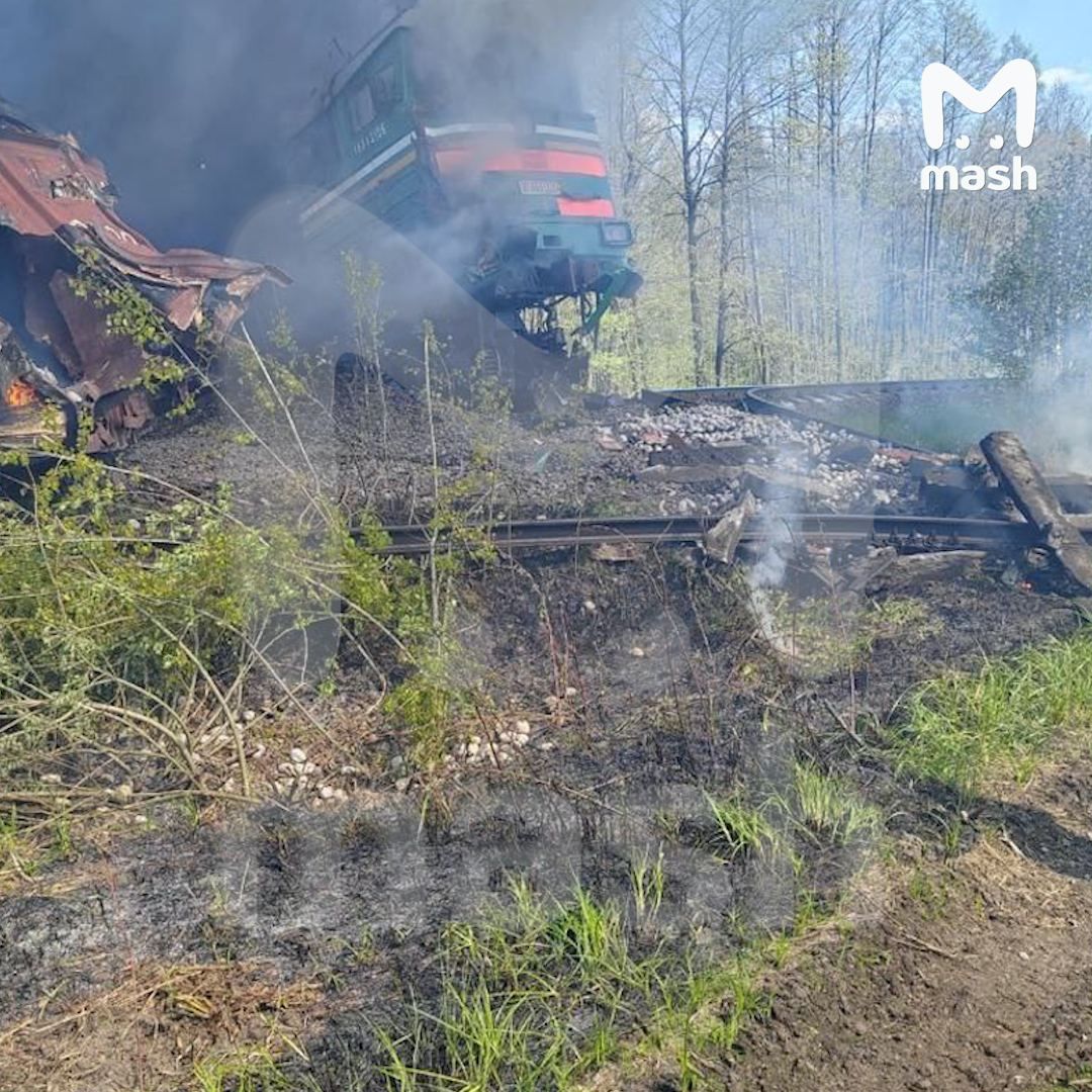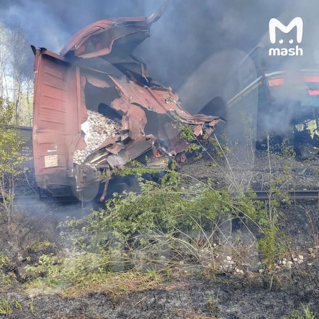 Ворожі ЗМІ пишуть, що інцидент стався о 10:17. З рейок зійшли локомотив і одразу сім вагонів вантажного поїзда.