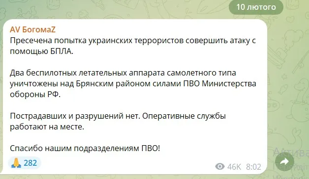 "Припинено спробу українських терористів зробити атаку за допомогою БпЛА. Два безпілотні літальні апарати літакового типу знищені над Брянським районом силами ППО Міністерства оборони Росії", – повідомив російський чиновник.