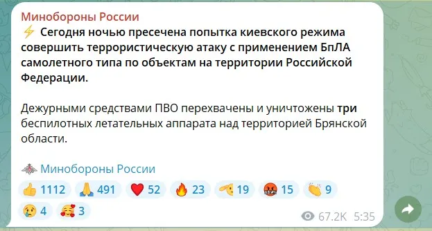 "Черговими засобами ППО перехоплено та знищено три безпілотні літальні апарати над територією Брянської області", – заявили у ворожому оборонному відомстві.