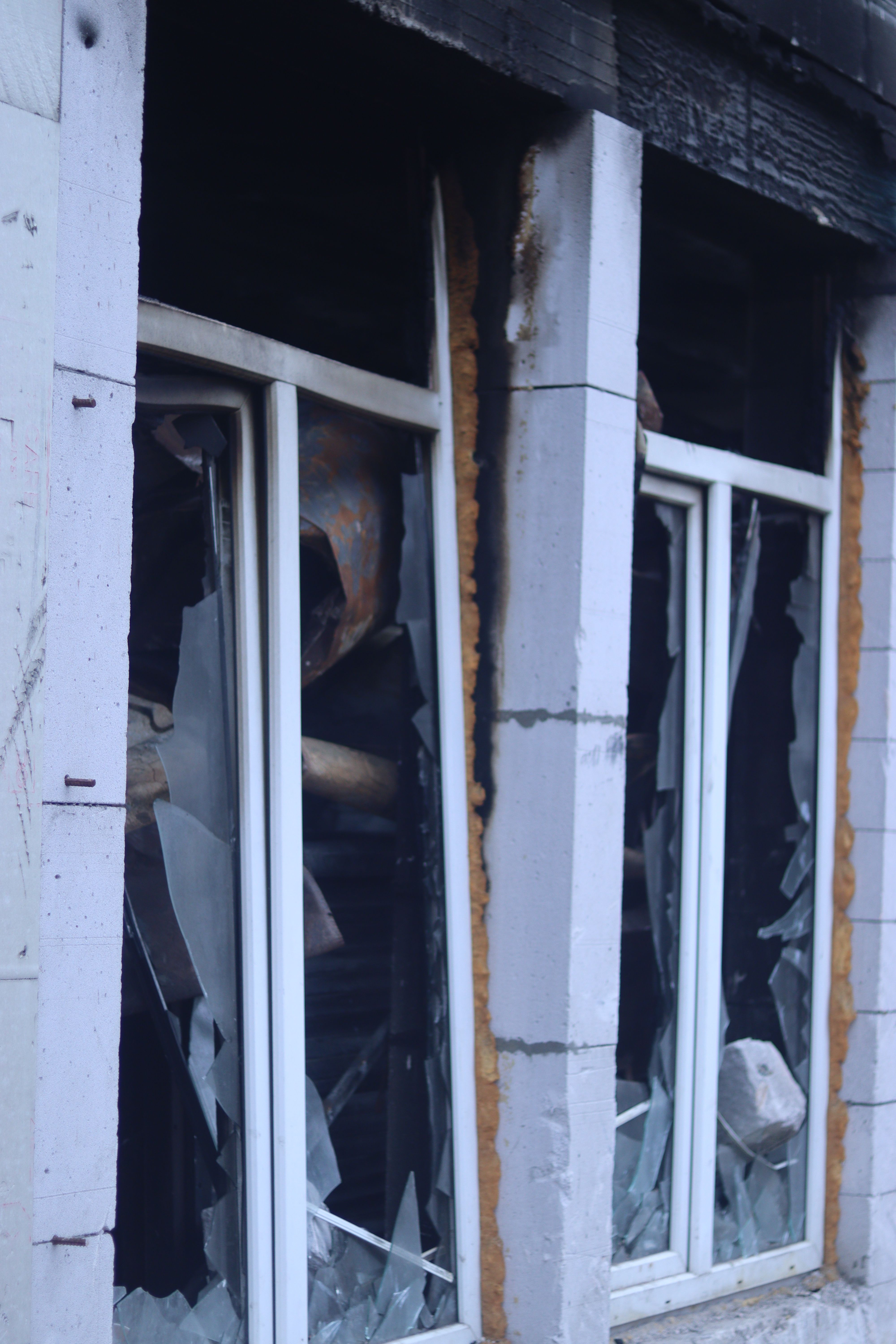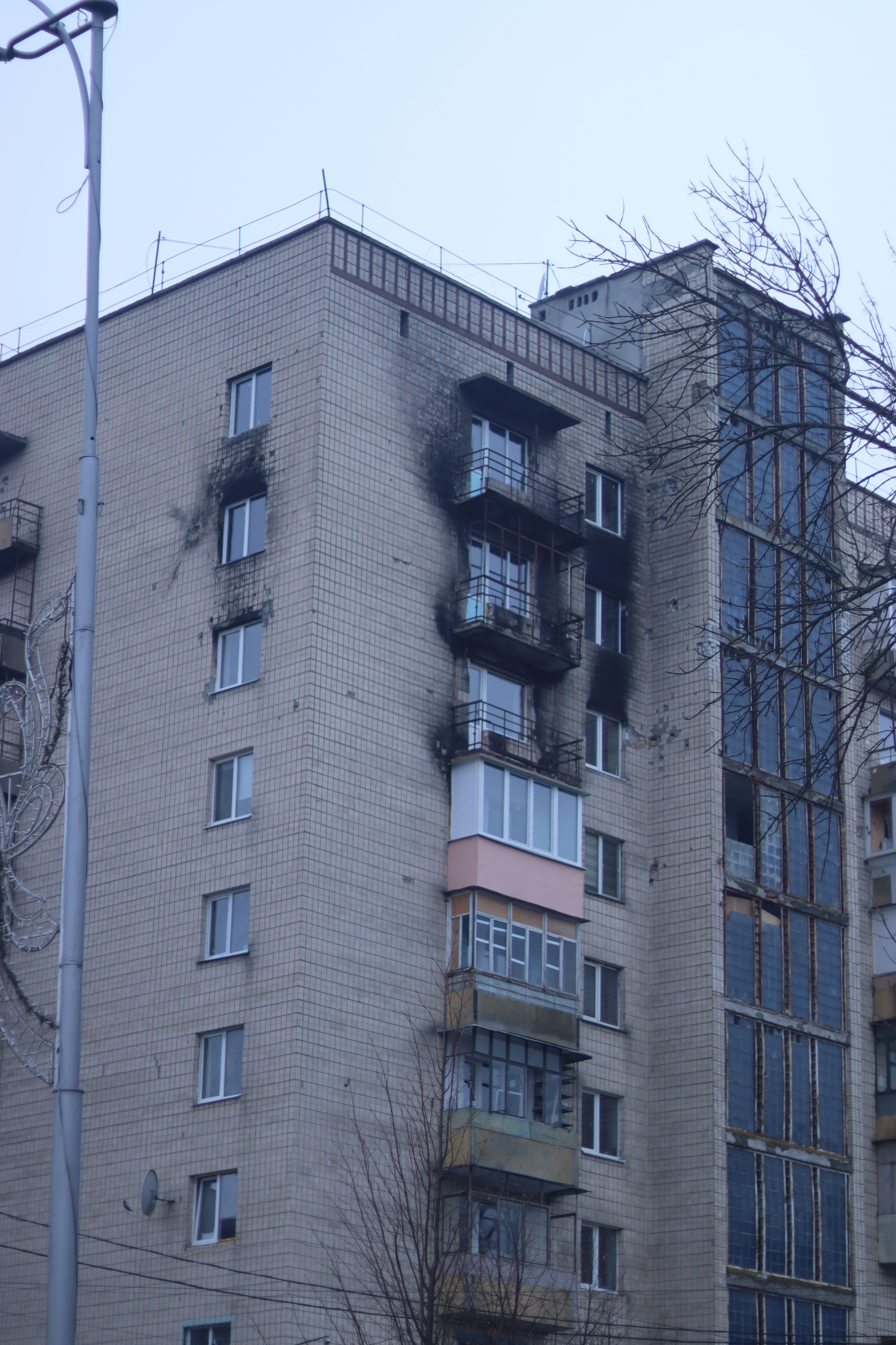 Однак в Ірпені, як і в інших містах, можна побачити сусідство життя та смерті через вулицю чи навіть на суміжних подвір'ях. Проте тут вони є сусідами в одному будинку. Неподалік центру біля будинку можна побачити місцевих, які займаються своїми справами. Сам будинок частково випалений. Десь досі вибиті вікна, а десь видно нові – там живуть люди.