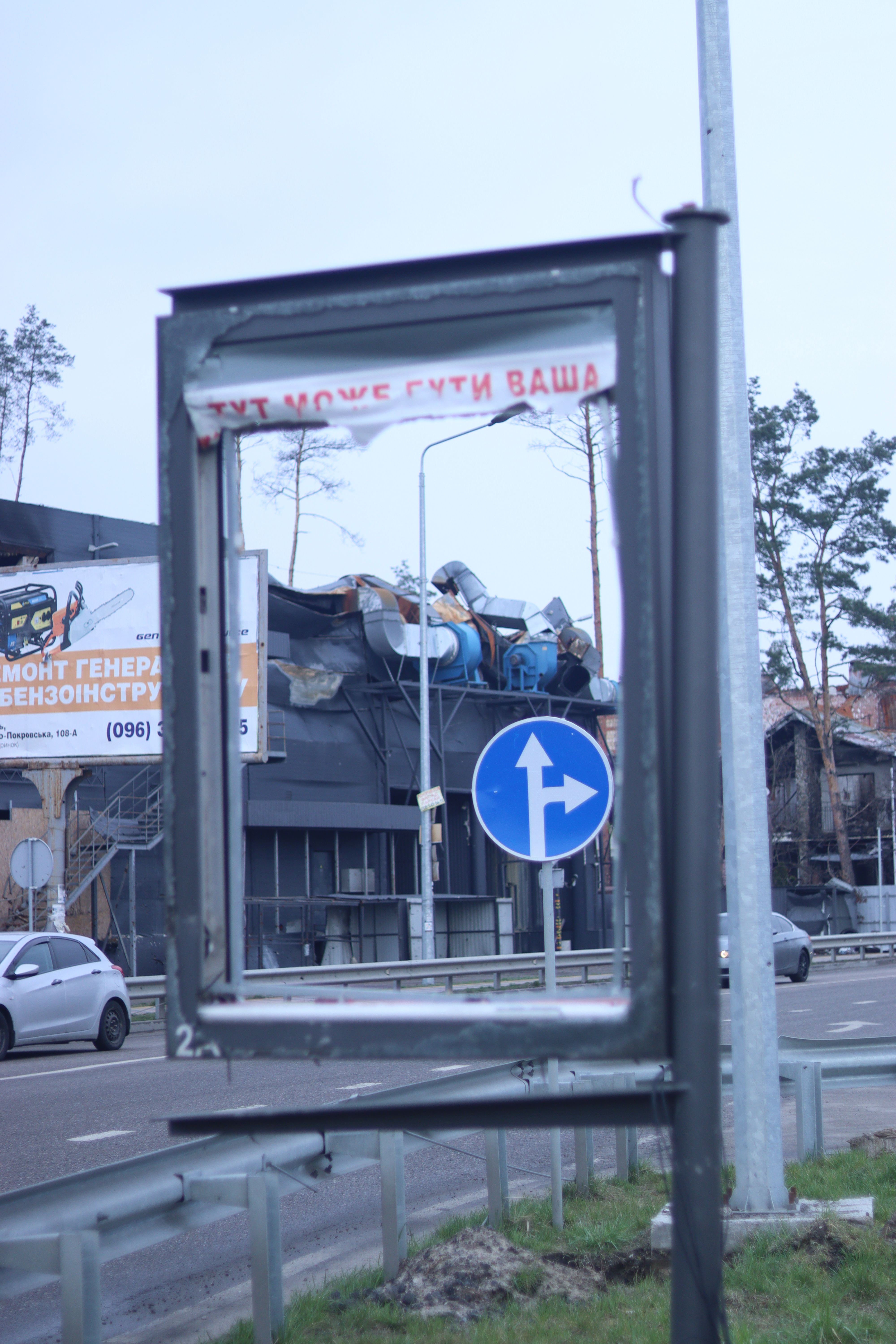 Далі дорога до Ірпеня. На околицях міста ми одразу ж побачили понищені будинки, деякі з них випалені повністю. Чим ближче до центру міста, тим менше видно руйнувань, але загалом вони є всюди.