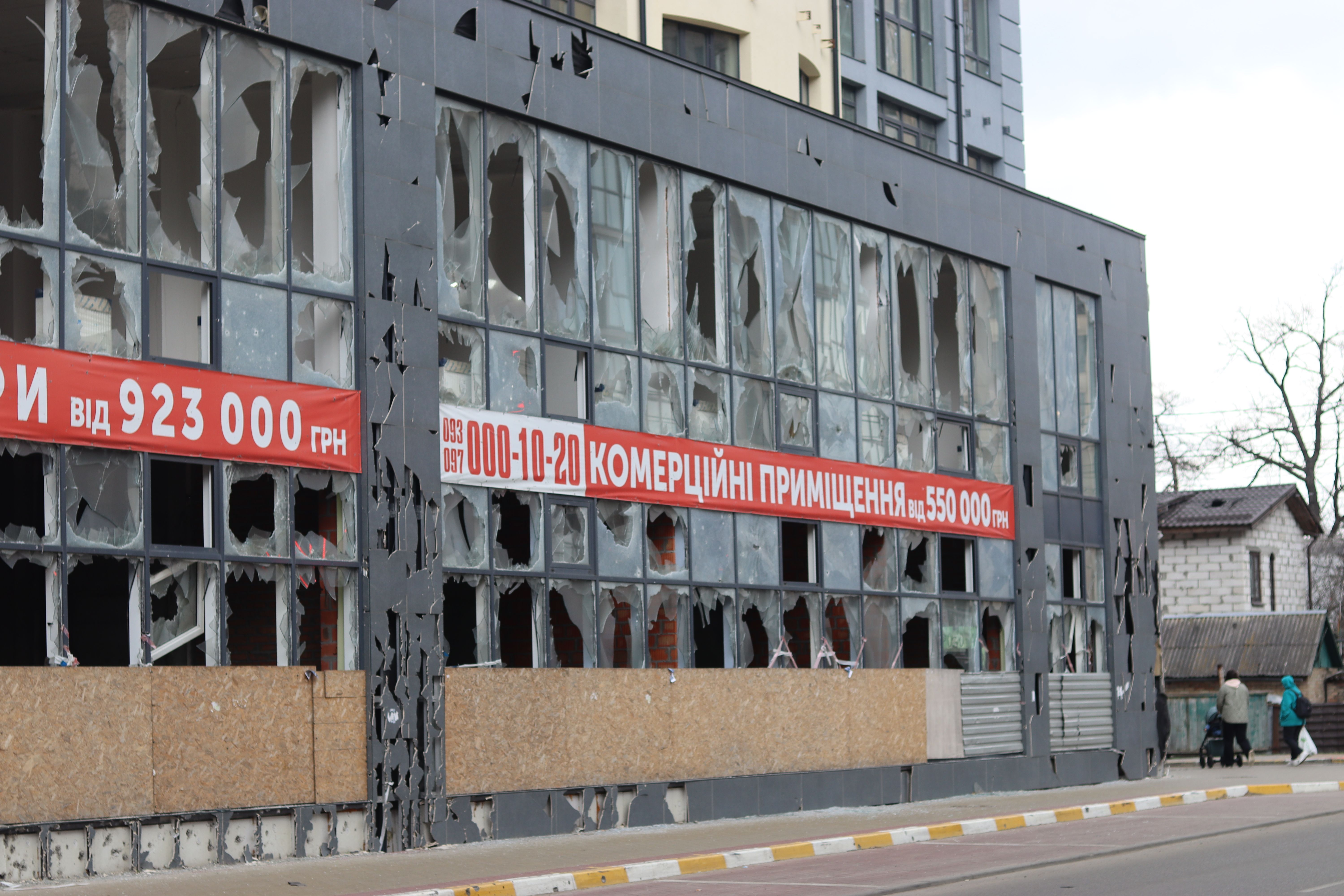Ірпінь не був повністю окупований росіянами, але за це заплатив високу ціну. Якщо пройтися самим містом, то можна побачити, що ледь не на кожному будинку є сліди від снарядів чи куль. Десь більше, десь менше. Однак дивних картин тут більше – з одного боку люди стоять на зупинці та чекають на автобус до Києва, а напроти них – зруйнований будинок. Позаду теж.