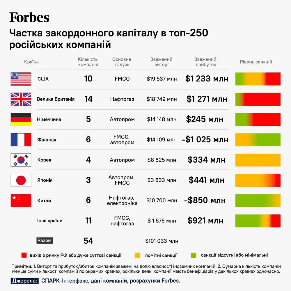 43 з 54 найбільших компаній Росії з іноземним капіталом, за даними українського Forbes, походять із 7 країн: