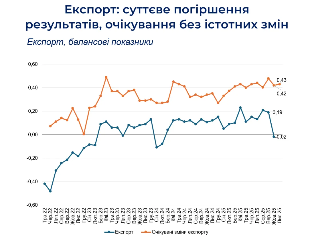 Ситуація в експорті відрізняється: індекс змін суттєво зменшився з +0,19 до -0,02 вперше з початку 2024 року – через збільшення частки тих, хто фіксує падіння експорту.