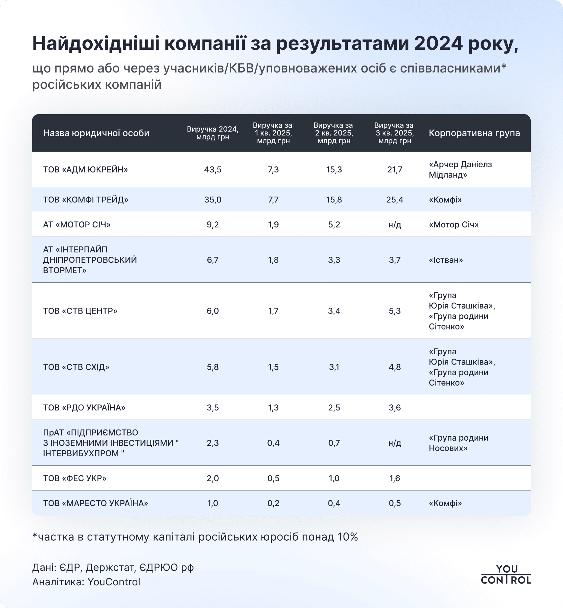 - Найбільшу виручку серед компаній з ймовірними російськими зв’язками отримали ТОВ "АДМ ЮКРЕЙН", корпоративна група "Комфі", АТ "МОТОР СІЧ".