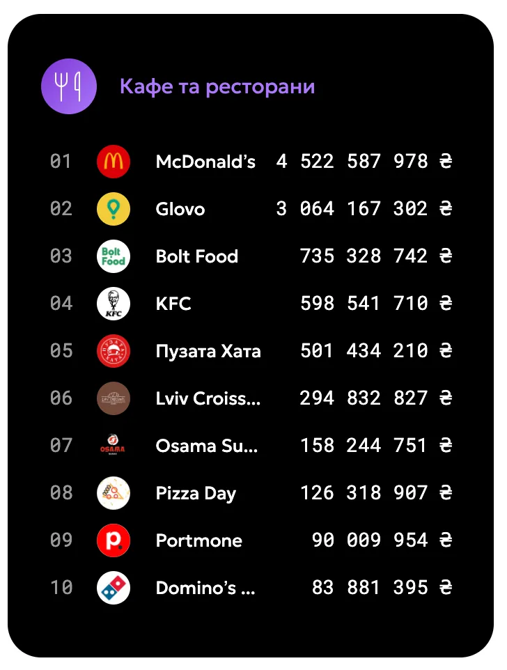 У категорії "Ресторани та кафе" за кількістю операцій лідирує McDonald’s. Далі йдуть сервіси доставки Glovo та Bolt Food, за ними – KFC, "Пузата Хата", Domino’s Pizza, Wolt, Lviv Croissants, Portmone, Bycet та Entree.