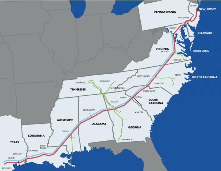 Компанія є найбільшою в США трубопровідною системою нафтопереробних продуктів і може транспортувати понад 3 мільйони барелів бензину, дизельного та реактивного палива між узбережжям Мексиканської затоки та районом Нью-Йорка. Трубопровід Colonial є ключовою артерією для східної половини США. Це основне джерело бензину, дизельного і реактивного палива для Східного узбережжя, його пропускна здатність становить близько 2,5 мільйонів барелів на день з Техасу до Північної Кароліни та ще 900 000 барелів на день до Нью-Йорка.Схема трубопроводу Colonial Pipeline / Фото The Progressive Pulse