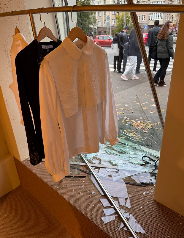 У шоурумі Etnodim вибуховою хвилею вибило вікна, пошкоджено фасад, двері та освітлення, але вишиванки залишилися неушкодженими. У команді бренду зазначили для "Віледж", що вікна тимчасово закриють плитами ДСП, аби магазин міг працювати далі.