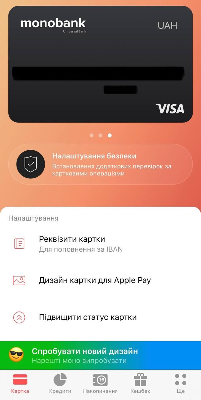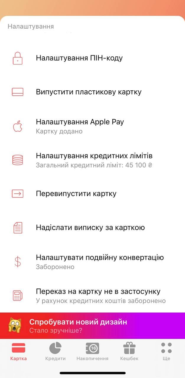 - Свайпніть вправо, аби перейти в налаштування картки (якщо дизайн застосунку старий),