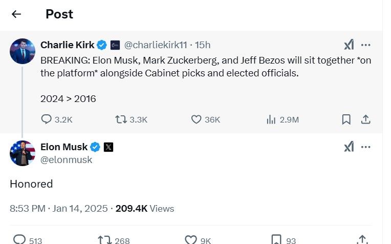 - Ілон Маск висловив гордість за можливість зайняти почесне місце на інавгурації.