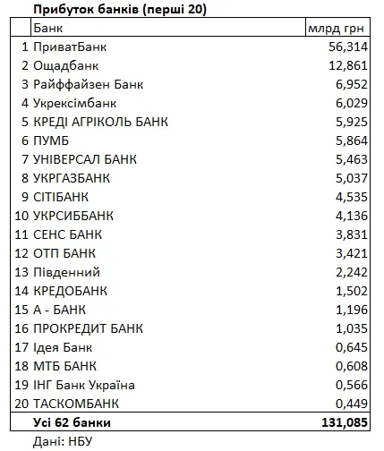 - ПриватБанк — 56,314 мільярда гривень, що становить 43% від загального прибутку банківської системи.