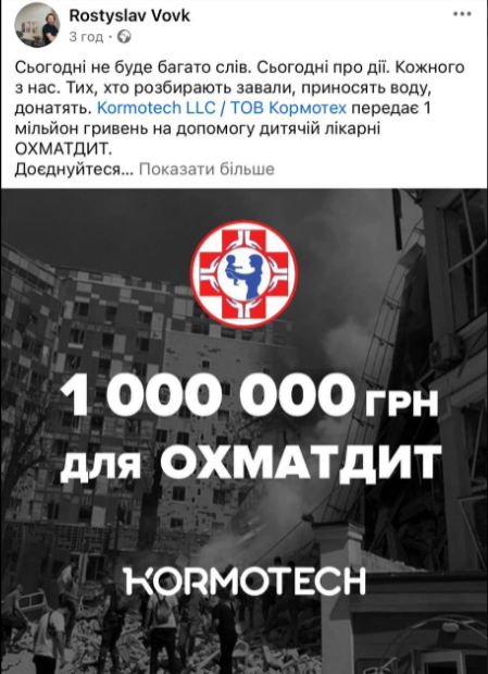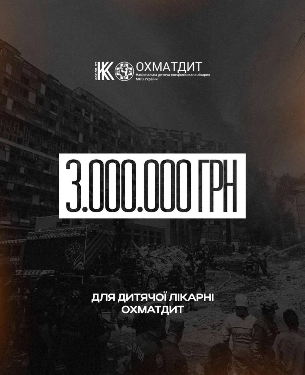 "Ми передамо 1 млн грн від Genesis і ще 1 мільйон гривень від мене особисто на закриття нагальних потреб лікарні. Також запустили внутрішній збір в нашій екосистемі – всі зібрані гроші передамо в Охмадит", – написав Многолєтній.