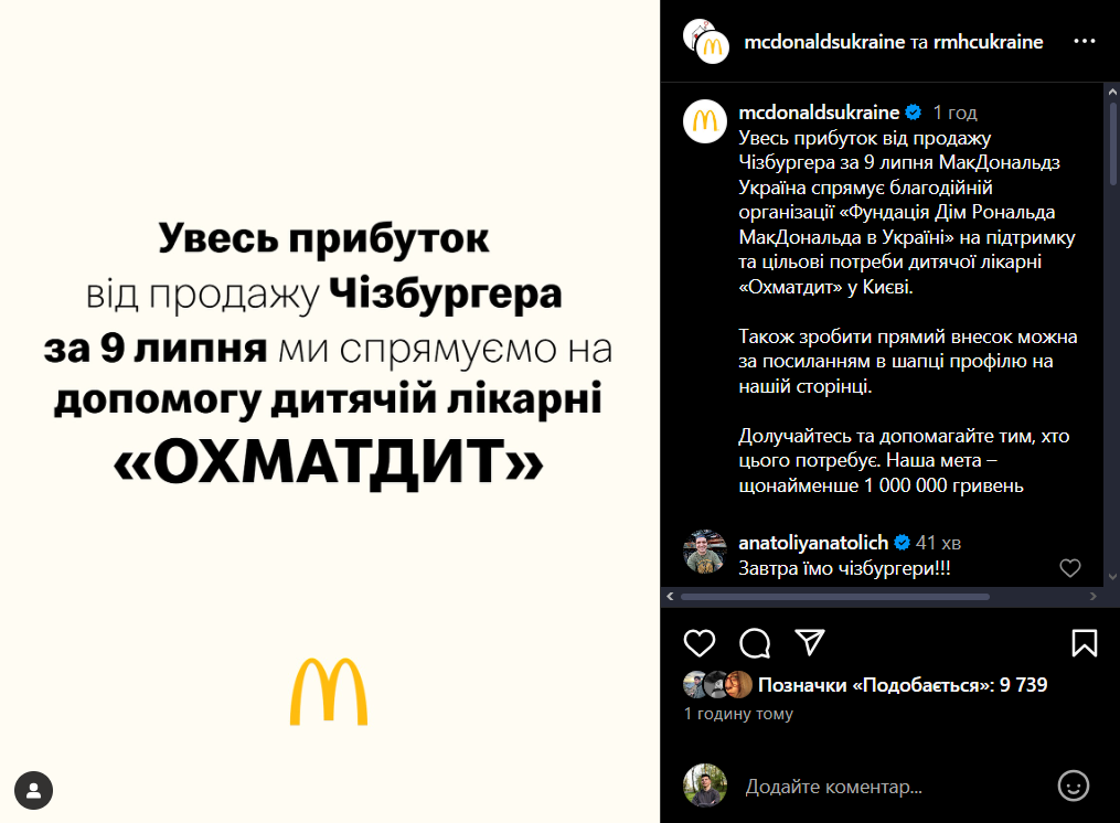 Також відомо, що McDonald's Ukraine передасть увесь їхній прибуток від продажу чізбургера 9 липня спрямують на підтримку та цільові потреби "Охматдиту".