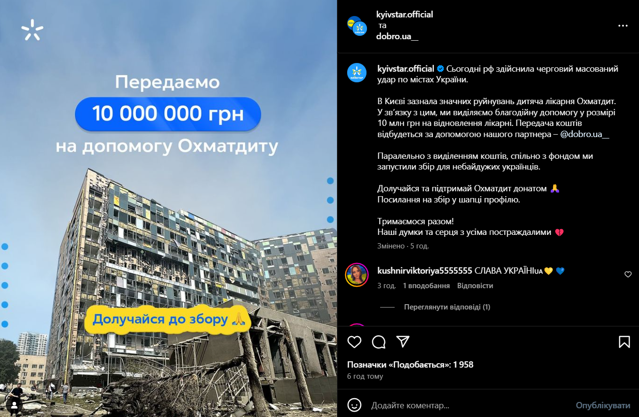 Український бізнес миттєво відреагував на масований удар з боку Росії, внаслідок якого було пошкоджено центральну дитячу лікарню Києва "Охматдит". Компанії надають фінансову допомогу, технічну підтримку та гуманітарну допомогу для відновлення лікарні та допомоги постраждалим.